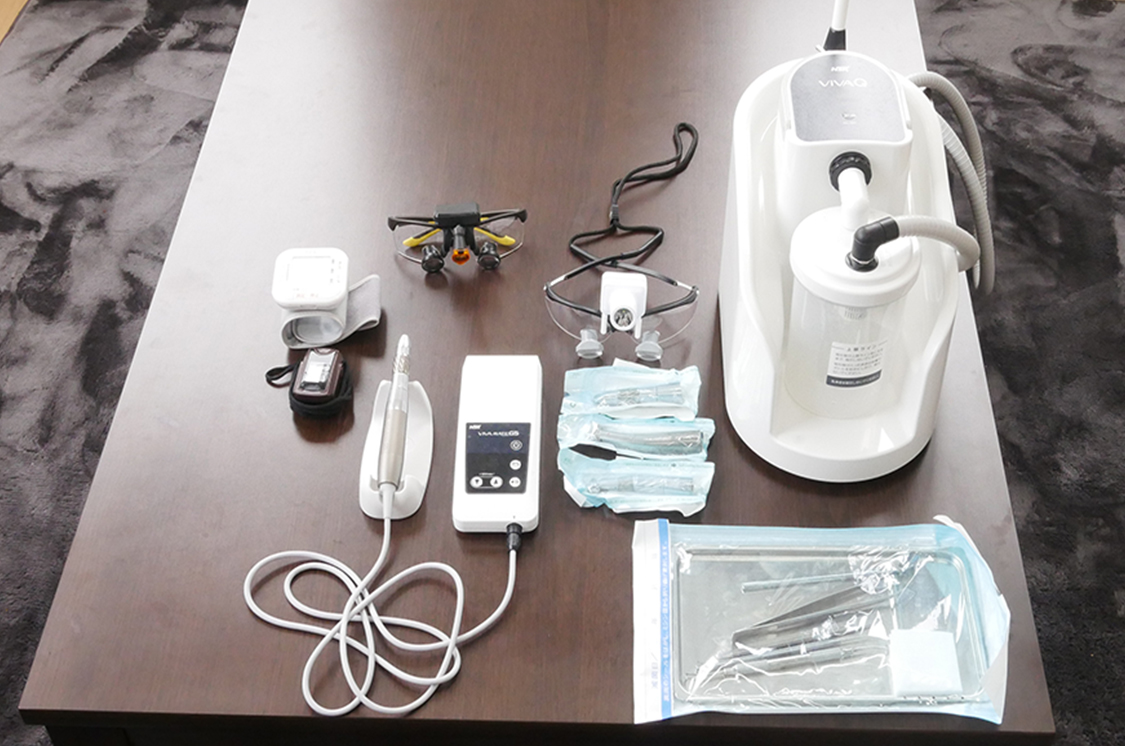 患者様の体調をモニタリングしながら診療を行います。 各種機材を用意しておりますので診療室と同様な診療が行えます。